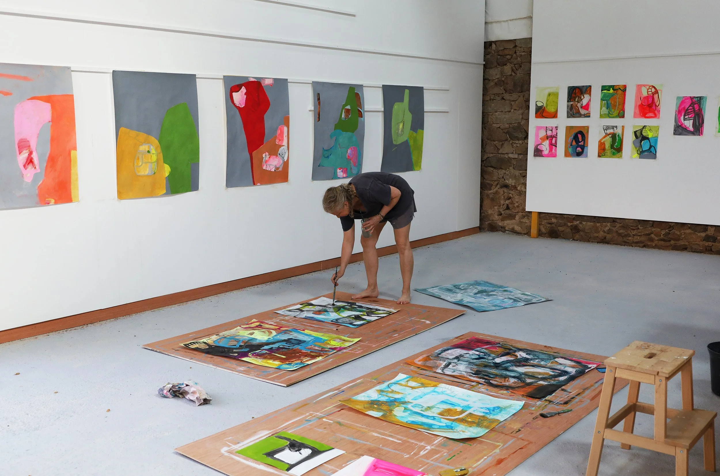 Lisa quickly settled into a daily pattern during her residency, working everyday in the studio, starting around 8am and finishing around 6pm; and bracketing each day with early morning and evening walks in the Morvan that fed into her drawings and studio compositions. All works are acrylic and crayon on paper, various sizes.